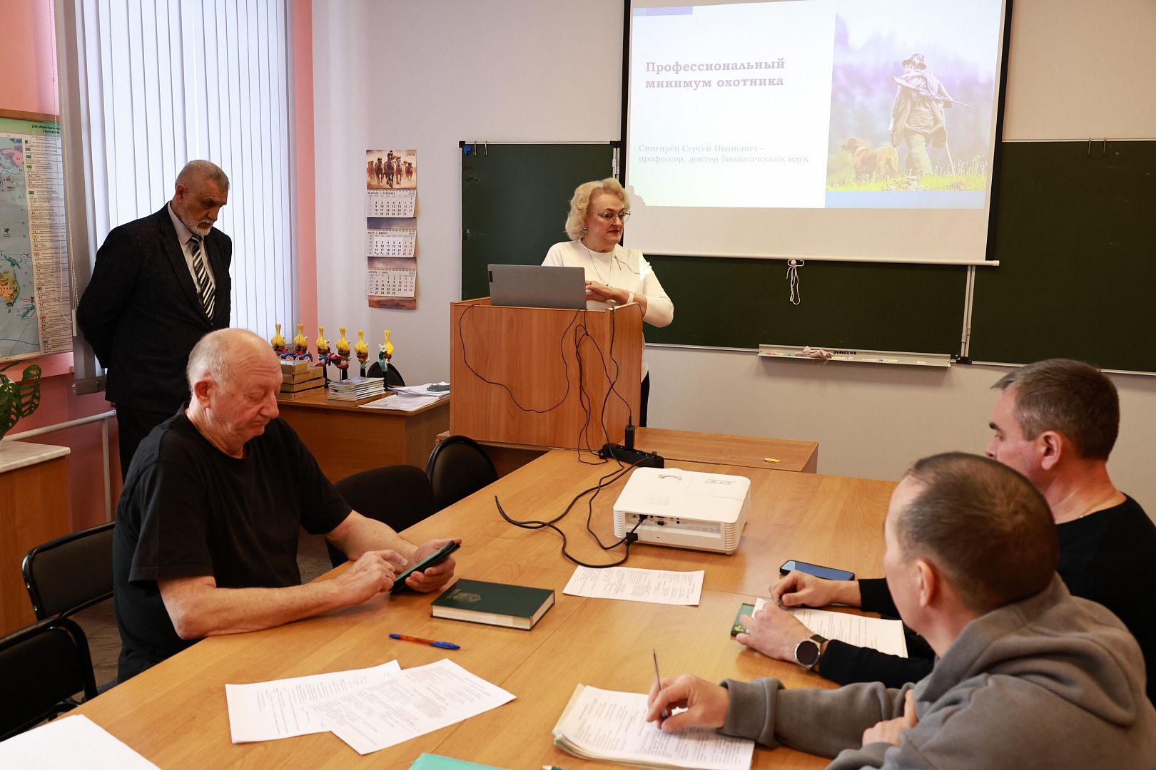 «Современных охотничьих собак применяют как в спортивной, так и в промысловой охотах на пернатую дичь, пушных и хищных зверей, крупных копытных животных. Все виды охот с собакой красивы и необыкновенно увлекательны, что способствует удовлетворению духовно-эстетических потребностей человека от общения с природой в процессе охоты. Я рассказал о классификации пород собак, видах охотничьего использования и сроках охоты с ними. Особое внимание уделено отечественным породам собак и специфике охоты с ними. Охотничья собака – это душа охоты, как говорил один из классиков русской литературы С.Т. Аксаков. «Настоящий охотник скорее пойдёт на охоту без ружья, но с собакой, чем с ружьем, но без нее». Собака обеспечивает результативность охоты и снижает потери подранков, что способствует сохранению популяций. Но удовольствие на охоте принесет лишь породистая собака, обладающая генетически закрепленными охотничьими качествами, для чего в Алтайском краевом обществе охотников и рыболовов (АКООиР) организована селекционно-племенная работа, проводятся выставки, полевые испытания и соревнования охотничьих собак. На встречу со слушателями был приглашен кинолог АКООиР, эксперт по породам борзых и гончих Анатолий Иванович Секержинский, который пообщался на эту тему с будущими охотниками».