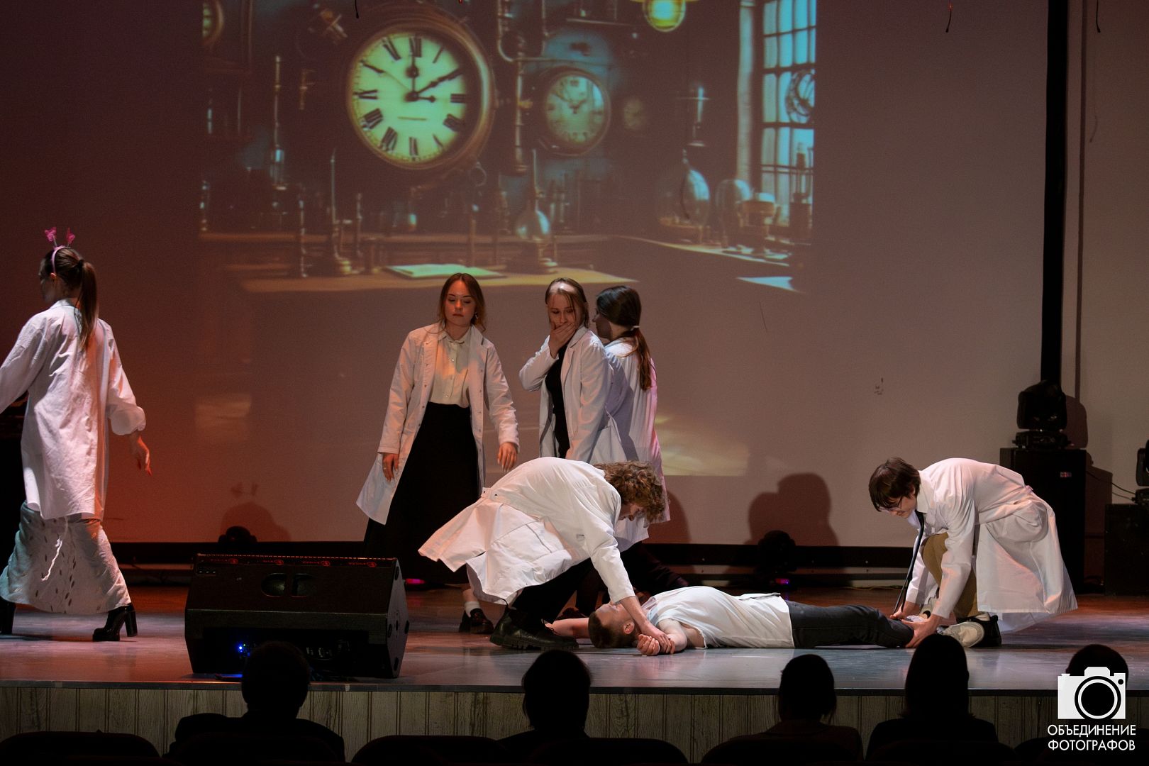 «К посвящению в специальность мы готовились всей группой, и у ребят было много идей, но в итоге мы остановились на самой подходящей. В нашей сценке главную роль исполнял Дмитрий Вахитов. Суть нашей постановки заключалась в том, что мы создаем препарат для воскрешения тела человека, однако он действует лишь на ограниченное время. После проведения эксперимента, человек оживает и начинает проявлять агрессию, но со временем успокаивается, начинает танцевать, демонстрируя процесс овладения своим телом, а мы присоединяемся к его танцу. Однако в конечном итоге «тело» ломается, и мы уносим его», – поделилась студентка 1 курса Юлия Пастухова.