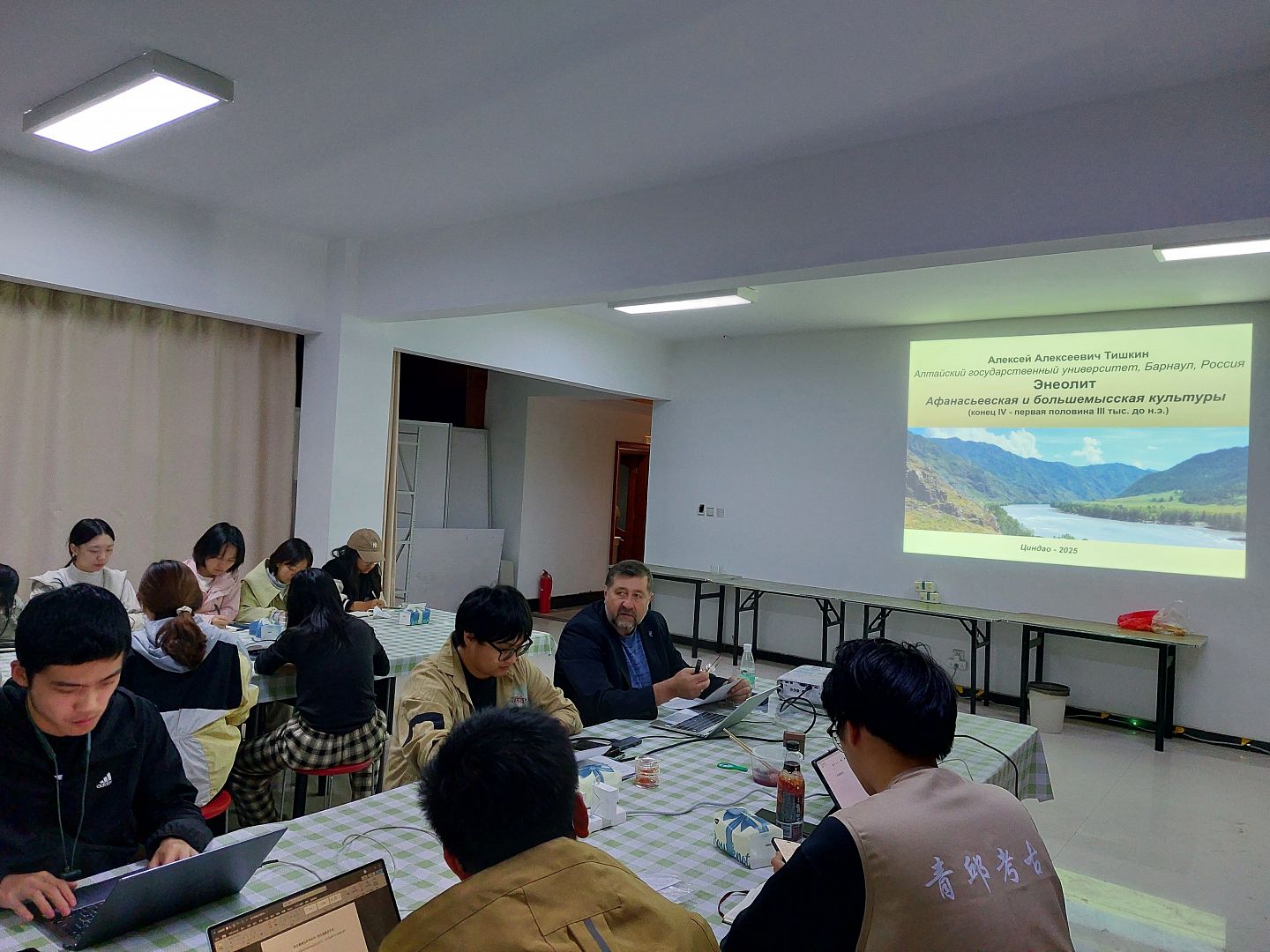 Представители АлтГУ также прочитали несколько лекций, находясь в Шаньдунском университете. Алексей Тишкин в первой лекции рассказал об изучении периода энеолита на территории Алтая, продемонстрировав результаты изучения афанасьевской и большемысской культур. Вторая лекция была посвящена периоду ранней бронзы в горном и лесостепном Алтае, и относится, соответственно, к каракольской и елунинской культурам.