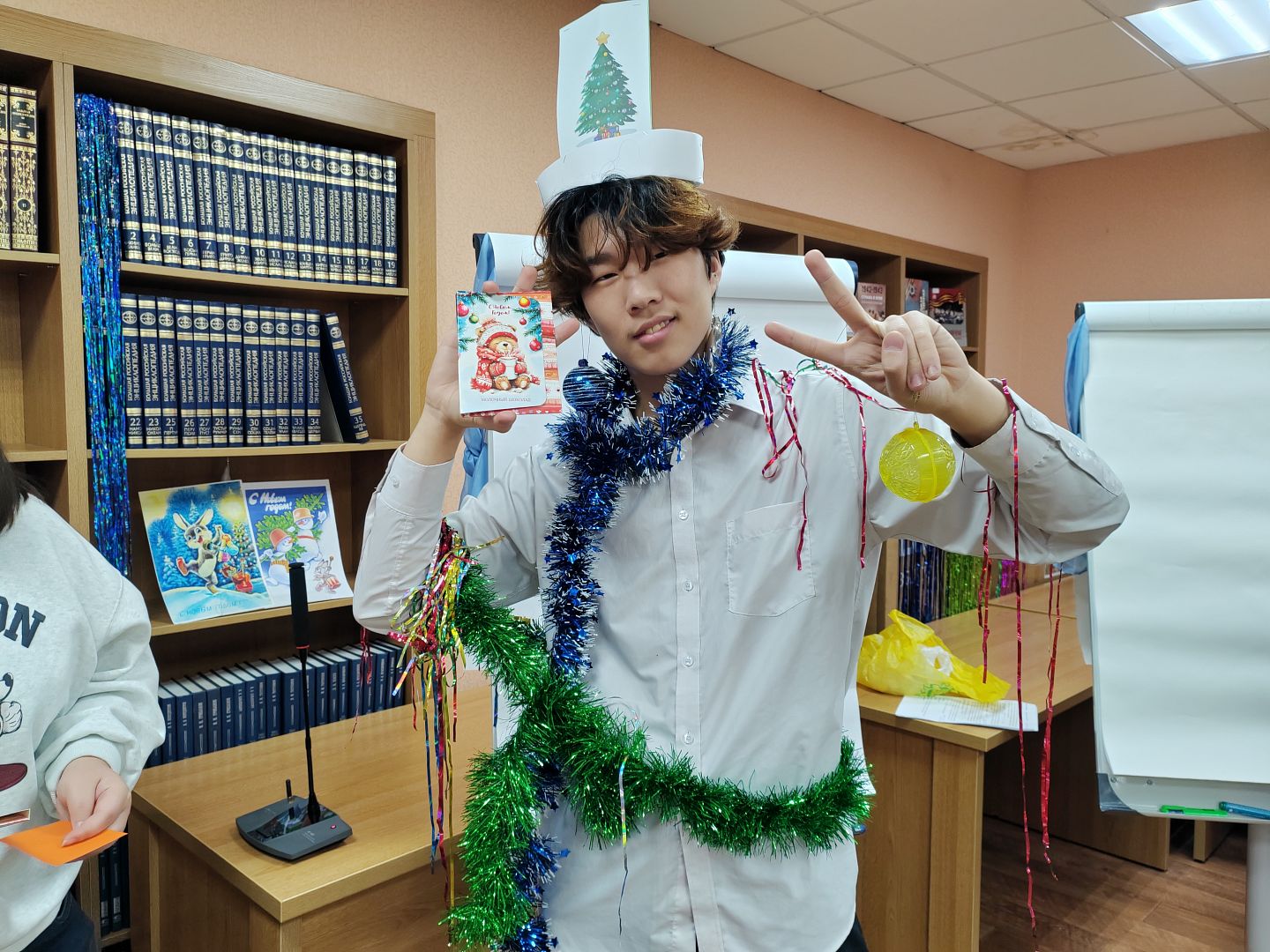 Для 98 иностранных ребят это первая зима в России. Многие впервые увидели снег, впервые надели варежки и теперь впервые готовятся встретить самый волшебный российский праздник – Новый год. Чтобы погрузить их в атмосферу, сотрудники библиотеки организовали интерактивную встречу «Новый год по-русски».