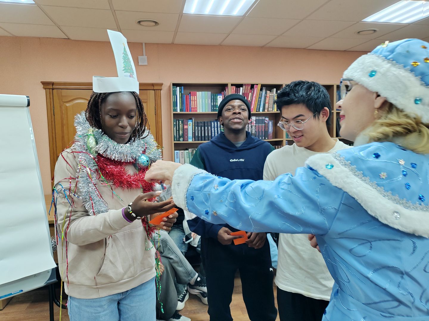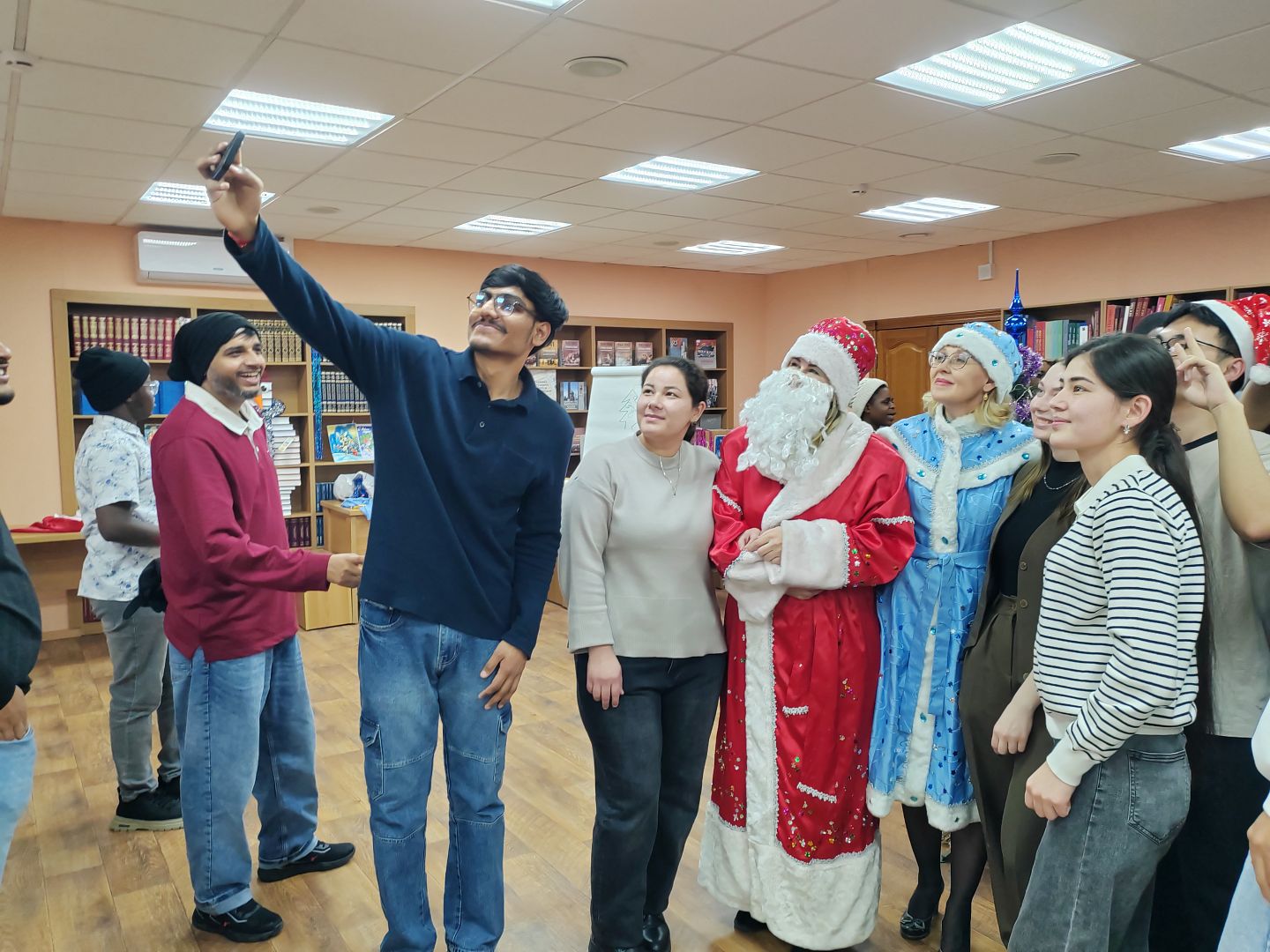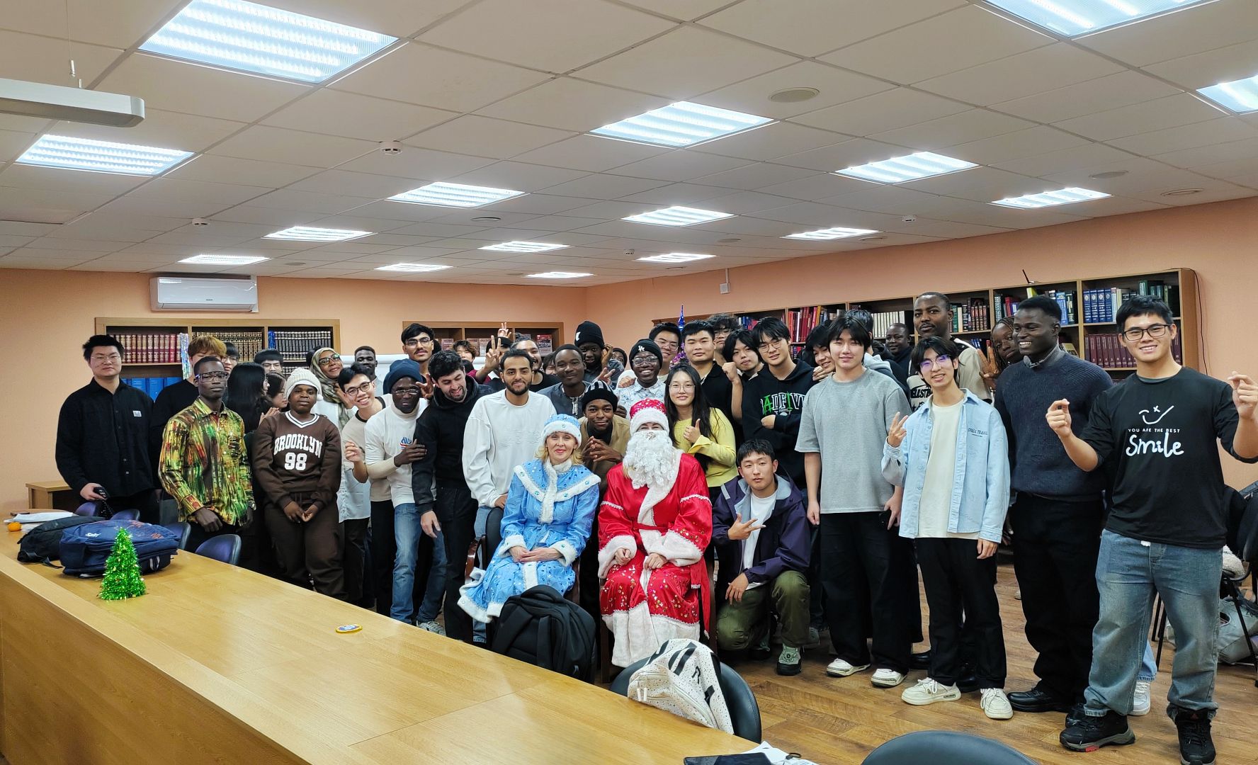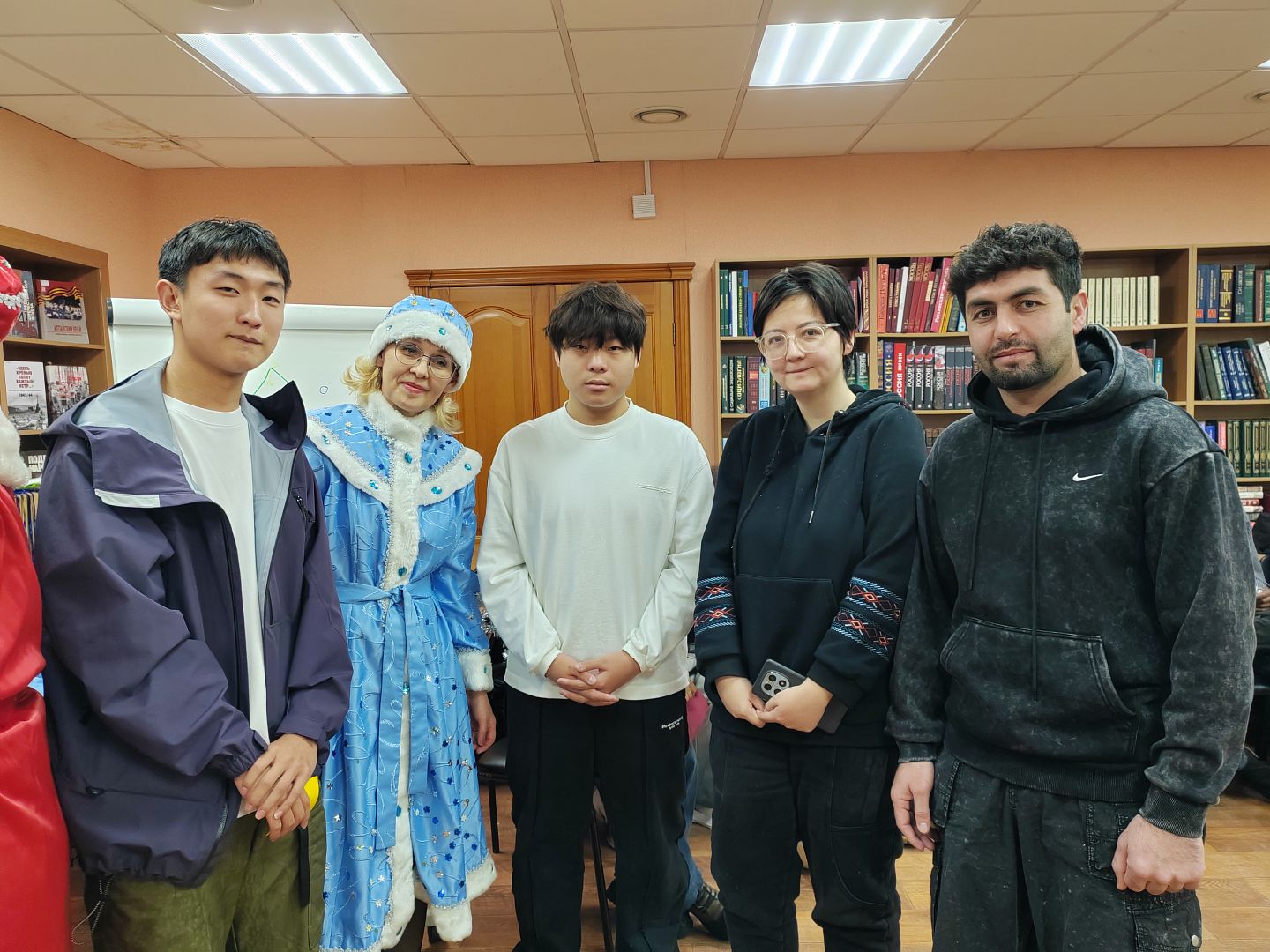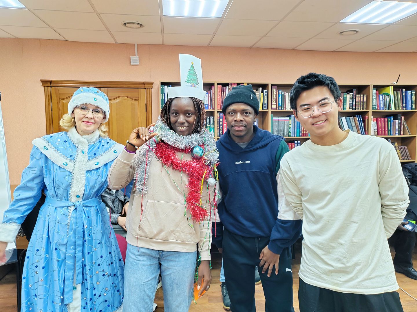26 декабря в читальном зале научной библиотеки АлтГУ прошла предновогодняя встреча для слушателей подготовительного отделения для иностранных обучающихся института гуманитарных наук из 22 государств: Туркменистана, Китая, Монголии, Вьетнама, Индии, Бангладеша, Йемена, Иордании, Саудовской Аравии, Ирака, Сомали, Марокко, Судана, Камеруна, Замбии, Зимбабве, Нигерии, Гвинеи-Бисау, Буркина-Фасо, Сенегала, ЮАР и Ганы.