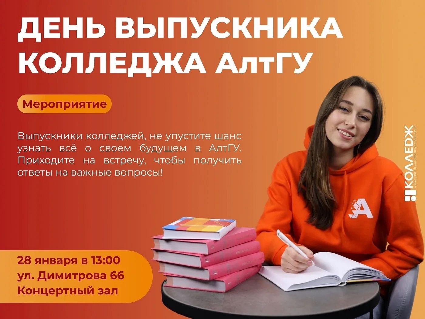 28 января в 13:00 в концертном зале АлтГУ (ул. Димитрова, 66) состоится масштабное мероприятие День выпускника колледжа АлтГУ.