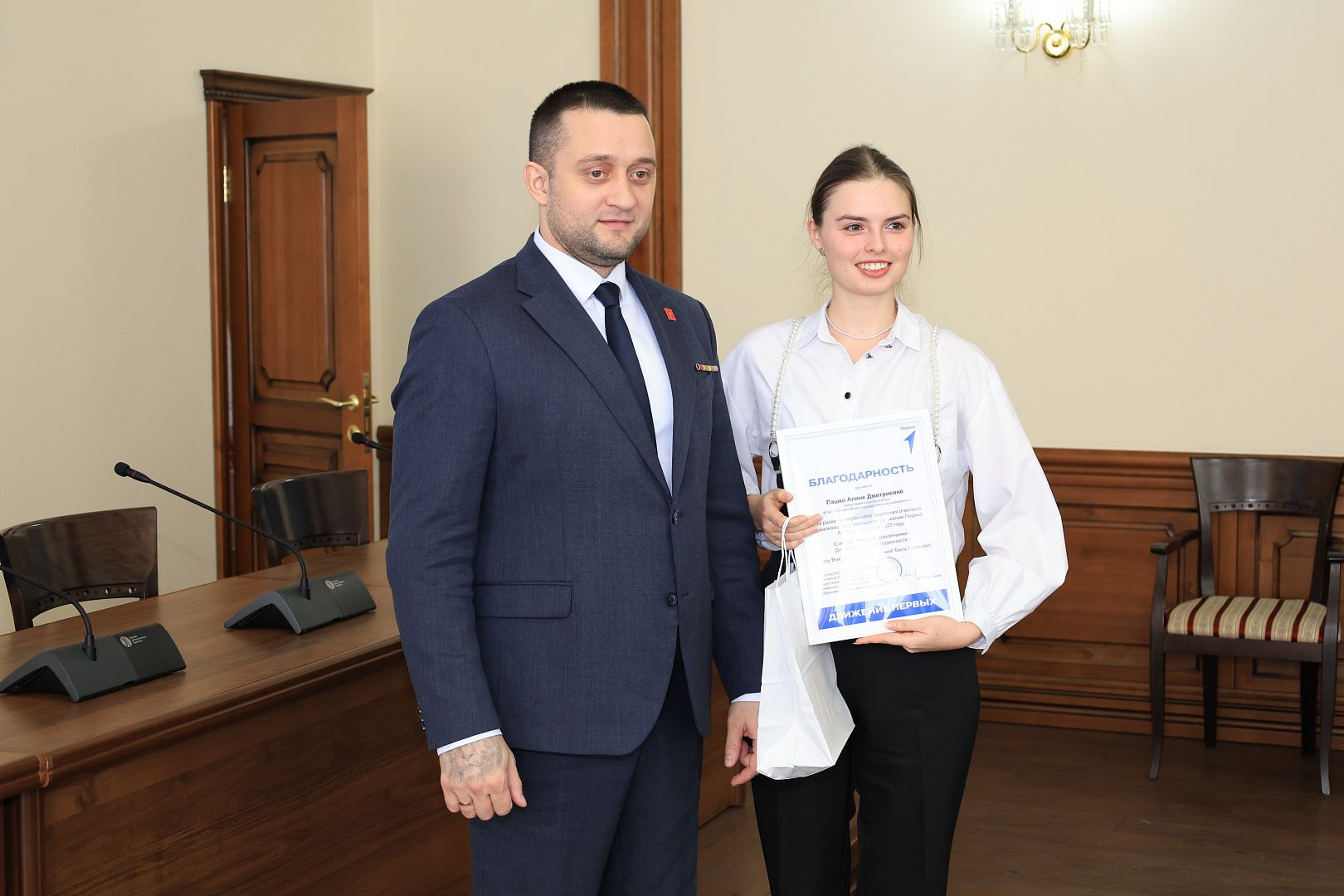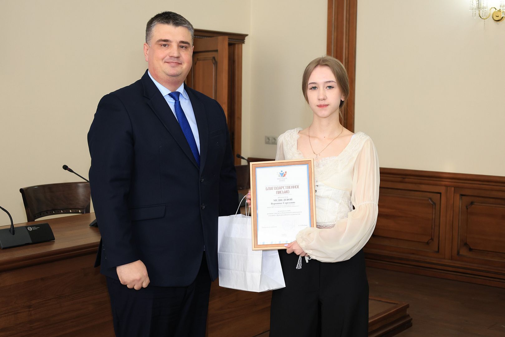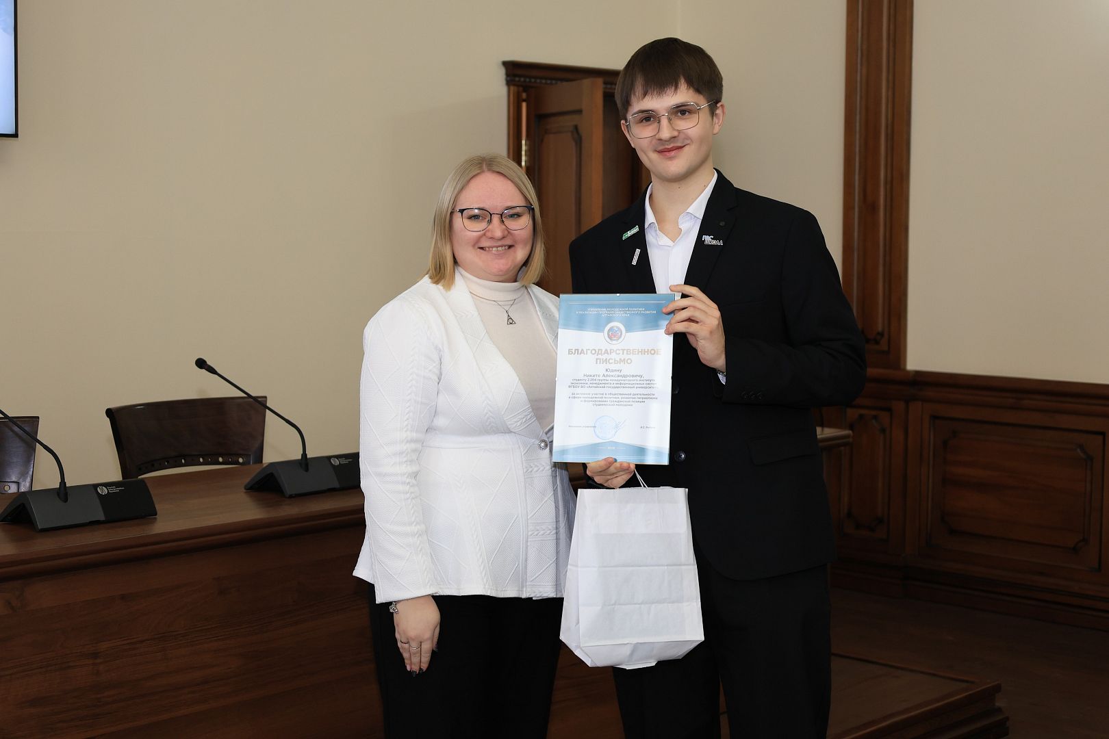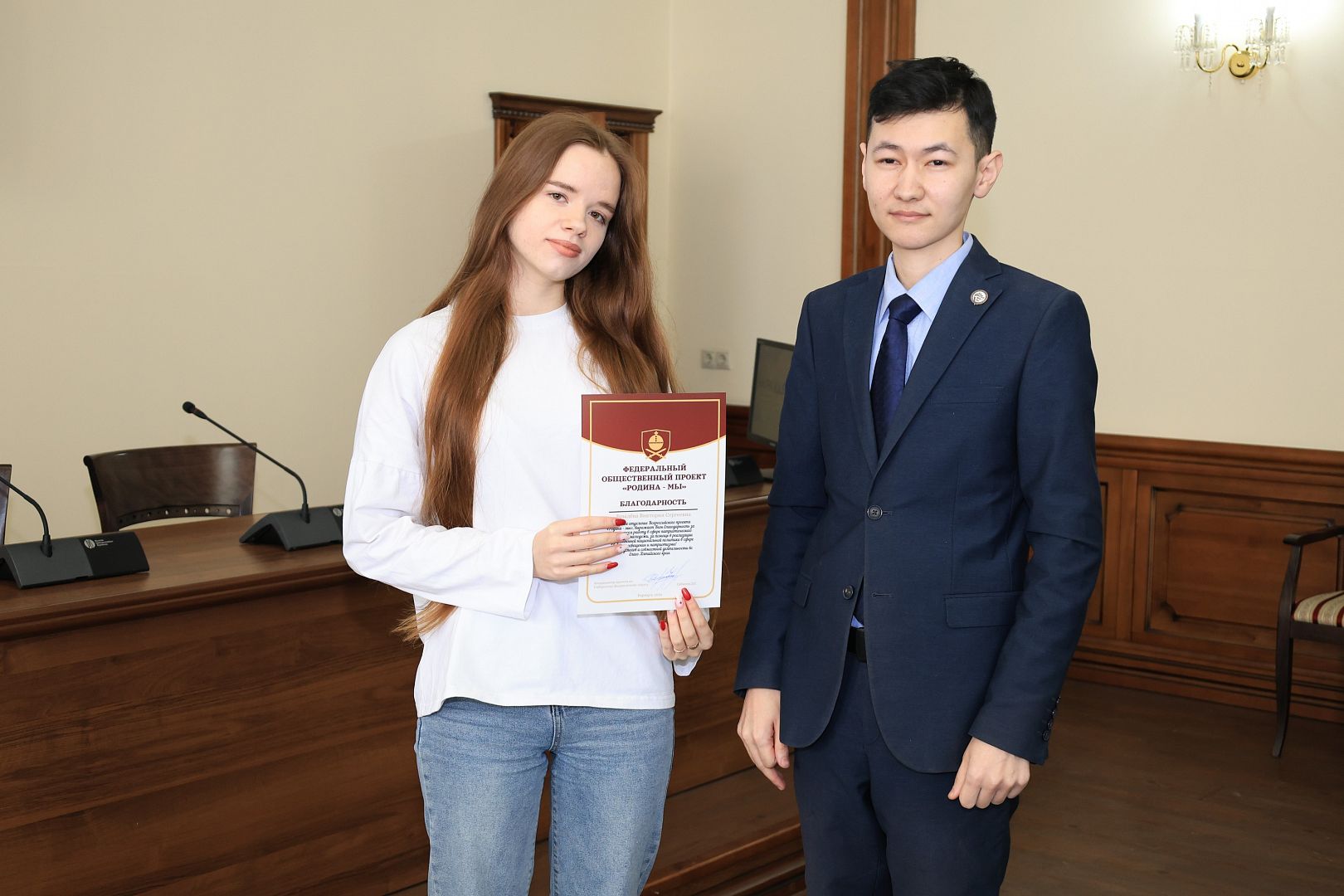 За активное участие в общественной деятельности в сфере молодежной политики, развитии патриотизма и формировании гражданской позиции студенческой молодежи Галина Берлизова вручила награды студентам: