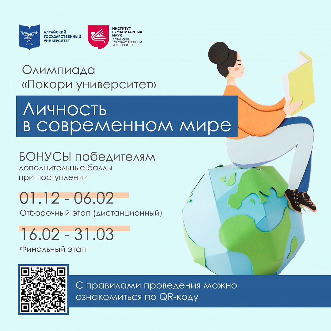 Институт гуманитарных наук Алтайского госуниверситета приглашает к участию в олимпиаде по психологии «Личность в современном мире» граждан Российской Федерации и иностранных государств, обучающихся 10-11 классов общеобразовательных организаций, обучающихся профессиональных образовательных организаций.