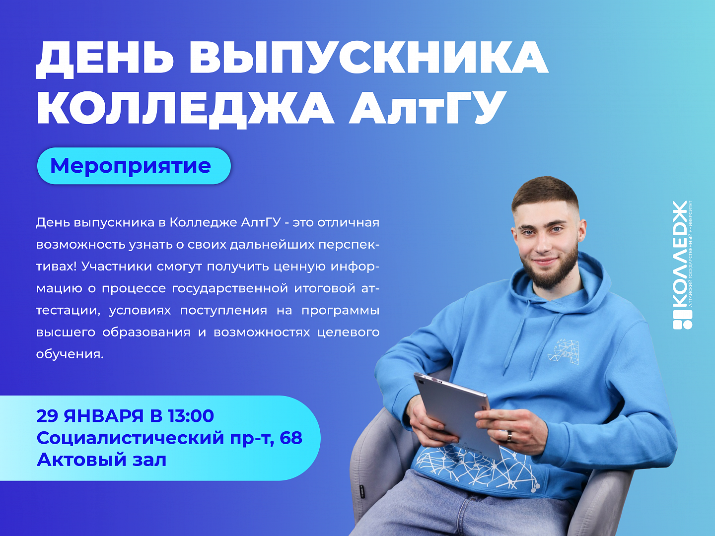 29 января в 13:00 в актовом зале корпуса С (Социалистический пр-т, 68) состоится День выпускника колледжа АлтГУ.