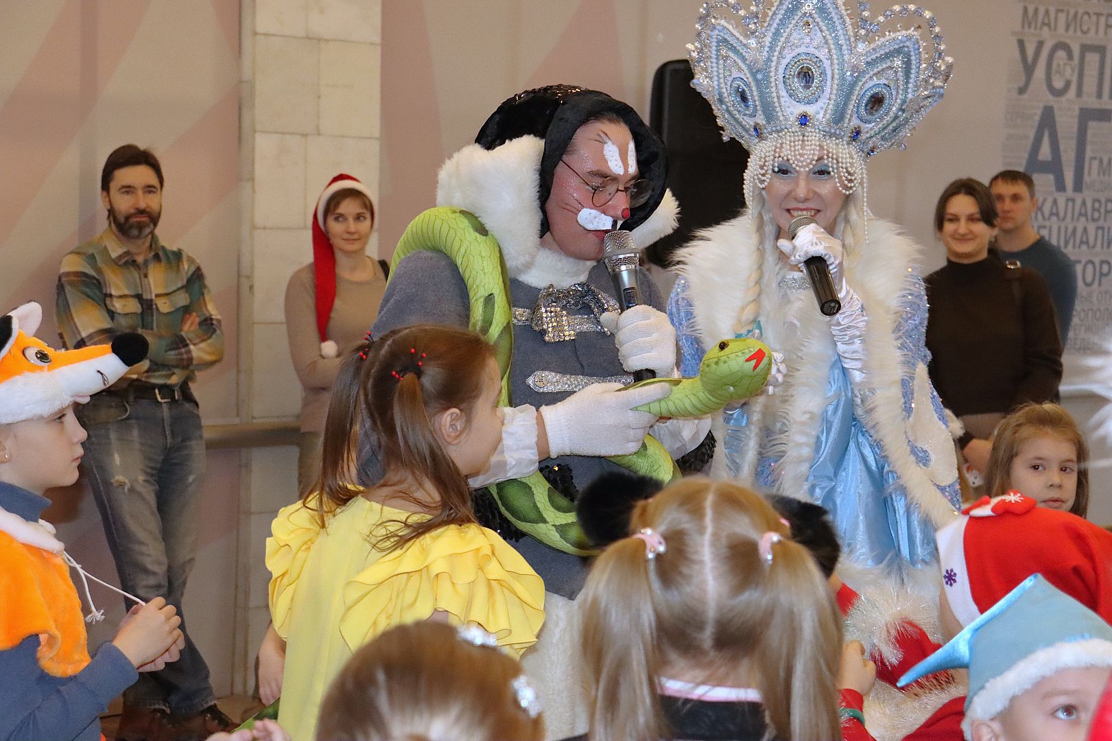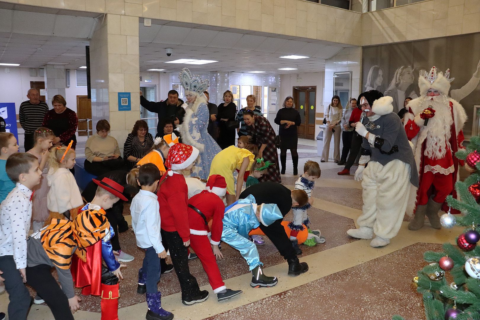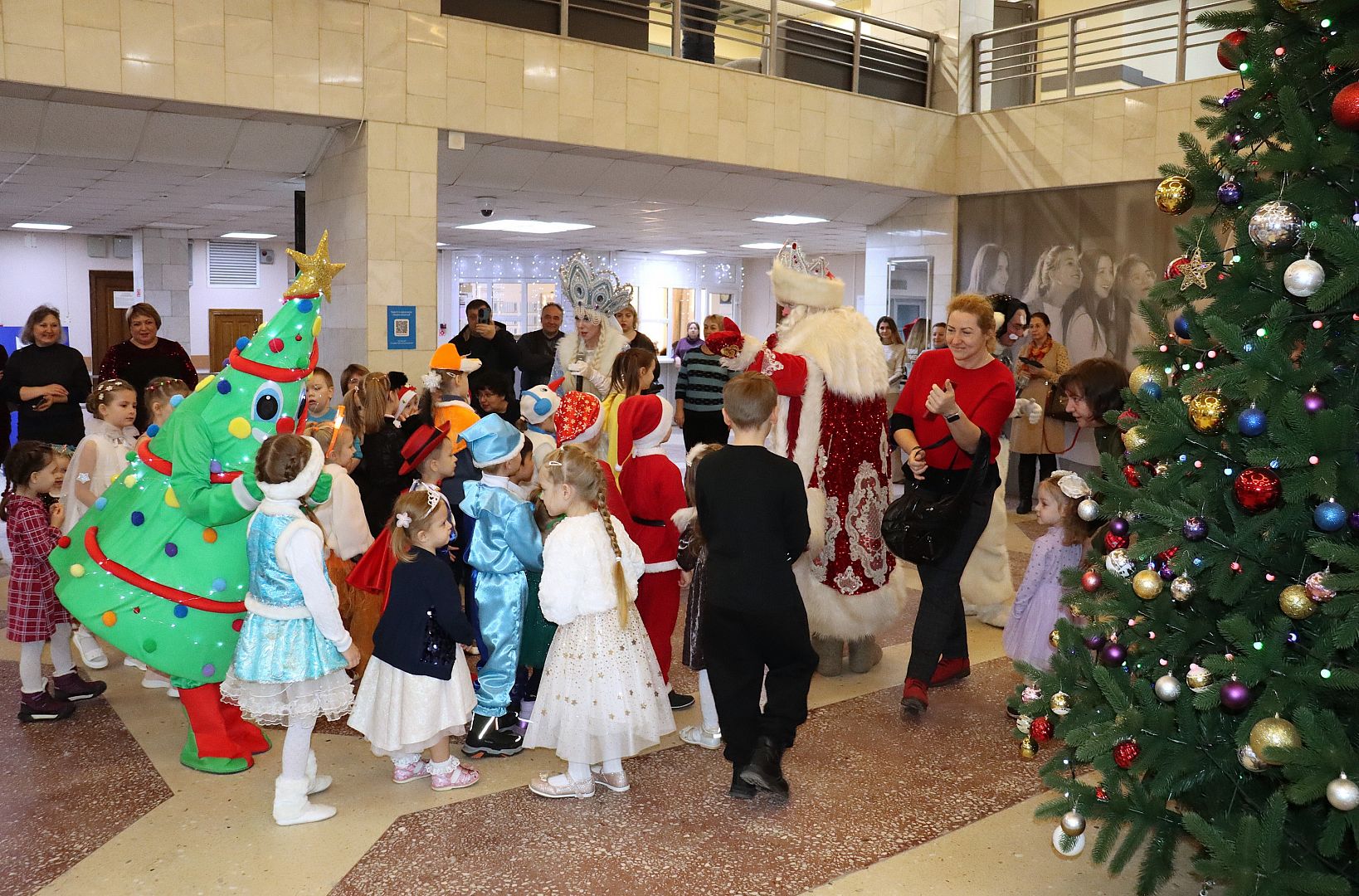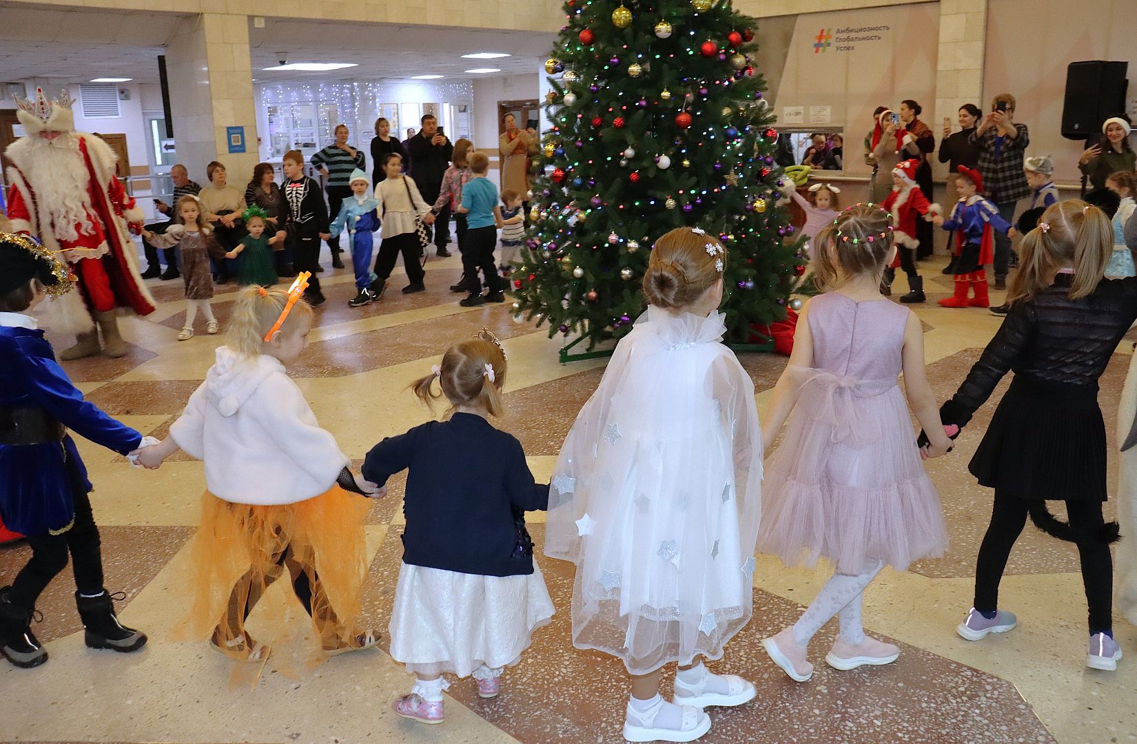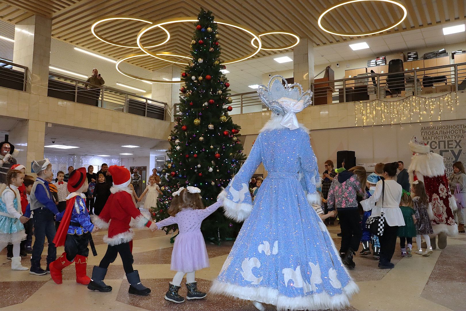 У елки в фойе главного корпуса вуза ребят встретили Дед Мороз, Снегурочка, Елочка и зайчик Снежок. Новогодние игры и эстафеты, яркий реквизит, зажигательный флешмоб и самые вкусные конфеты за участие в конкурсах. Как это было – смотрите в фотоотчете.
