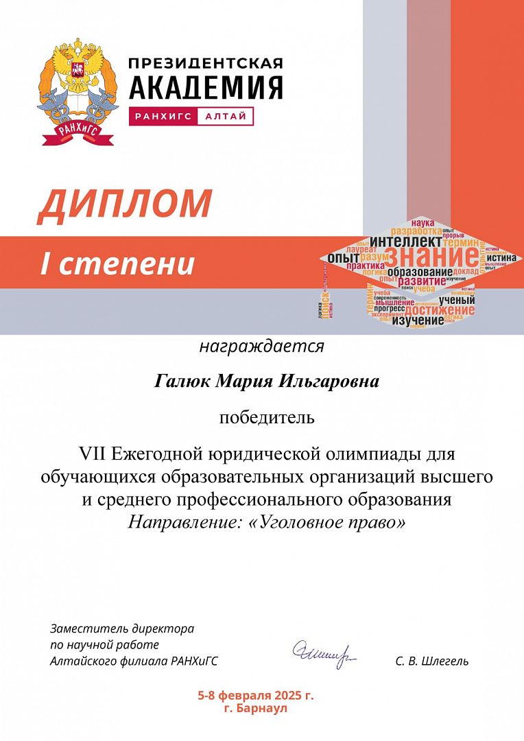 – Я впервые участвовала в такой олимпиаде. Выбрала направление «Уголовное право», потому что именно эта отрасль представляет для меня особый интерес. Честно, было очень волнительно, так как изучать уголовное право я начала не так давно. Впечатление от олимпиады осталось положительное, – поделилась Мария Галюк, студентка колледжа АлтГУ.