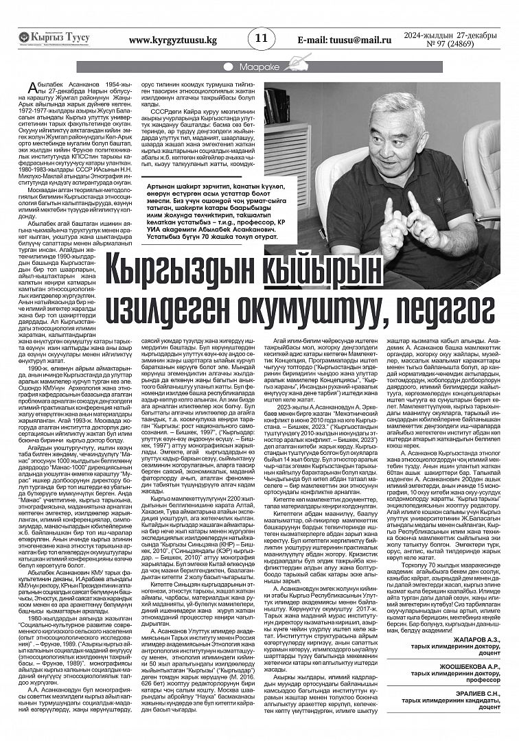 – Абылабек Асанканович с самого начала работы Центра активно участвует в наших этнографических экспедициях. Благодаря его работе доказана общность многих элементов в культуре кыргызов и народов Алтая. Мы уверены, что результаты его исследований приведут к значительным научным открытиям, – отметил Иван Назаров, поздравляя академика.