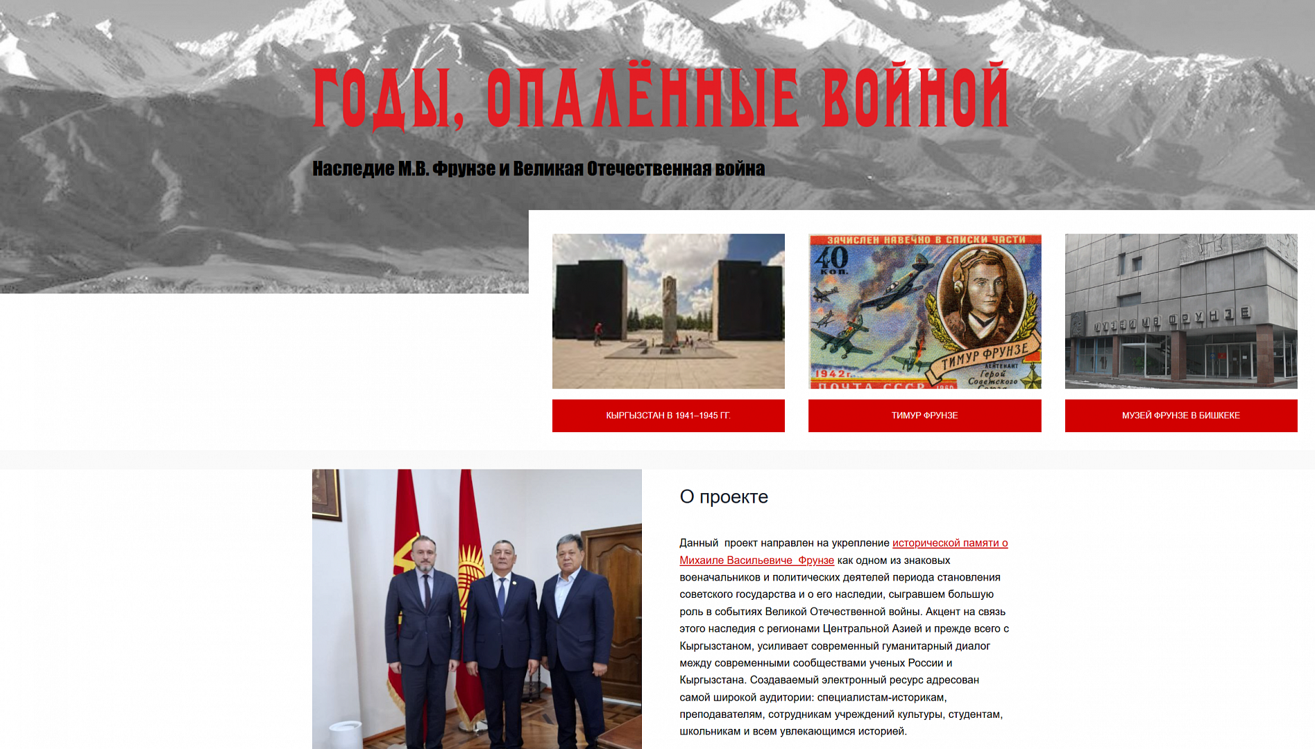 Кроме того, в центре внимания историков – деятельность музея М.В. Фрунзе в Бишкеке. Он был создан почти сразу после смерти Фрунзе-старшего и долгое время развивался как мемориальный музей, расположенный в доме, где жила семья. В советское время над ним был надстроен целый музейный комплекс, ставший центром скопления информации о Фрунзе. Этот раздел проекта подчеркивает важную роль музея в сохранении наследия исторической памяти и о самом Фрунзе, и об организациях, структурах, которые носили его имя и принимали участие в войне.