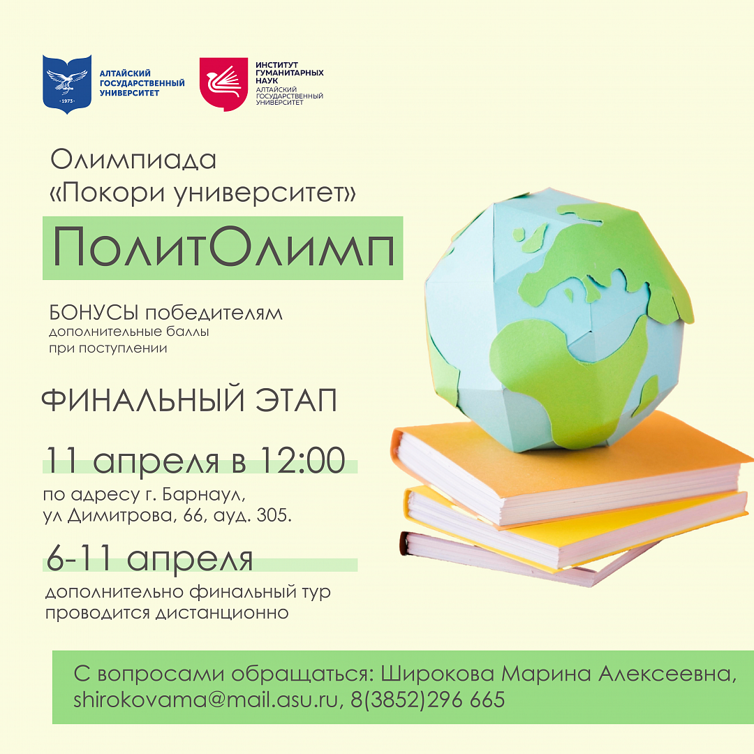 Финал Открытой предметной Олимпиады по обществознанию (политология) «ПолитОлимп» состоится очно 11 апреля 2026 г. (суббота) по адресу: г. Барнаул, ул Димитрова, 66 (корпус «Д» Алтайского государственного университета), аудитория 305 Д.