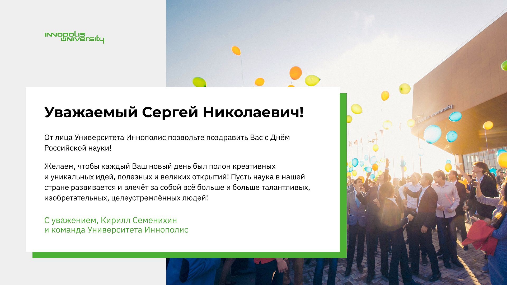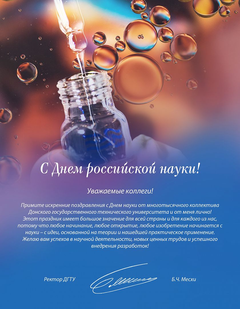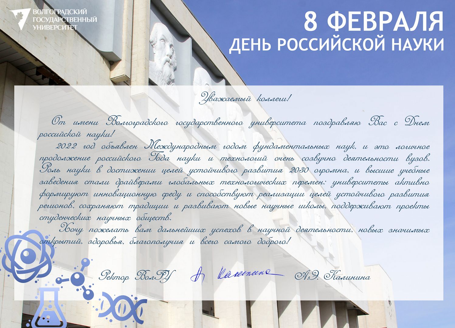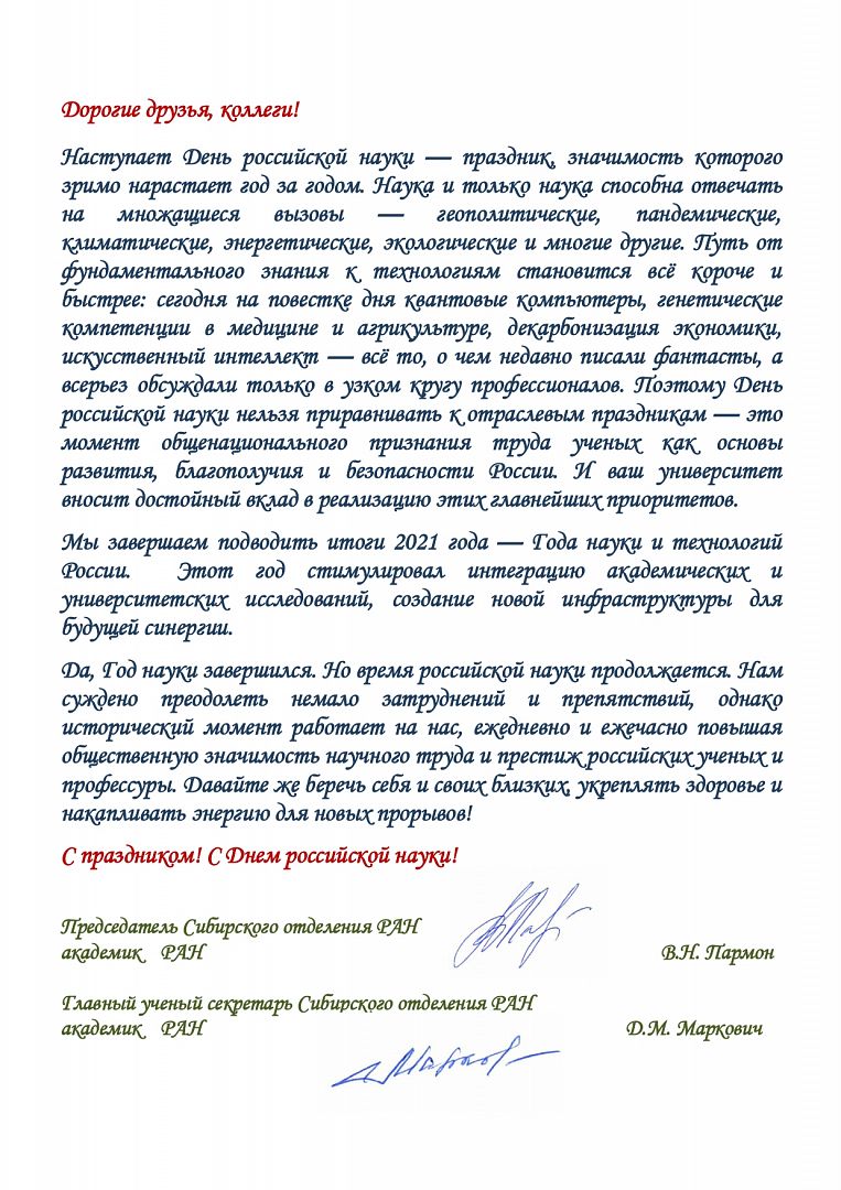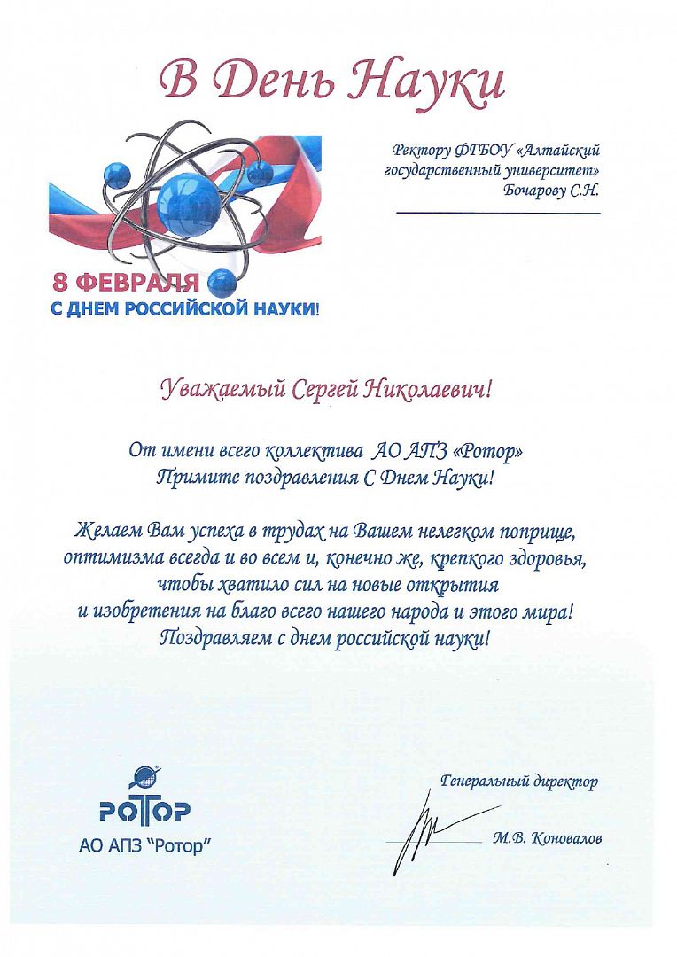 Также в адрес АлтГУ поступили поздравления с Днем российской науки из Чешского агротехнического университета, Института водных и экологических проблем СО РАН, от директора Университета Иннополис Кирилла Семенихина, председателя Сибирского отделения РАН Валентина Пармона, от ректора БГТУ им. В.Г. Шухова Сергея Глаголева, ректора Донского государственного технического университета Бесариона Месхи, генерального директора алтайского приборостроительного завода «Ротор» Максима Коновалова и других наших партнеров.