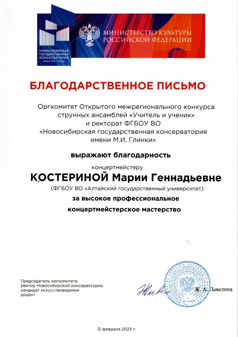 Творческий коллектив кафедры искусств института гуманитарных наук Алтайского государственного университета вошел в число победителей Открытого межрегионального конкурса струнных ансамблей «Учитель и ученик», организованного Новосибирской государственной консерваторией им. М.И. Глинки при поддержке Министерства культуры Российской Федерации.